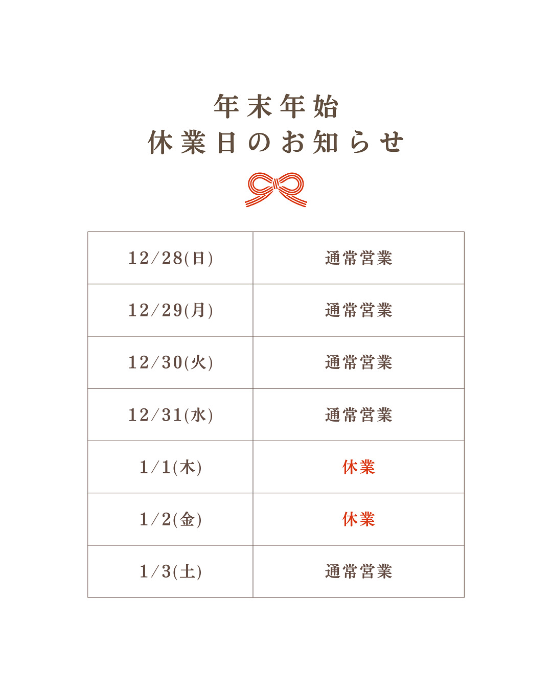 定休日予定だった28日と30日ですが、急遽オープンすることになりました。 1月1日・2日はお休みとなります。
