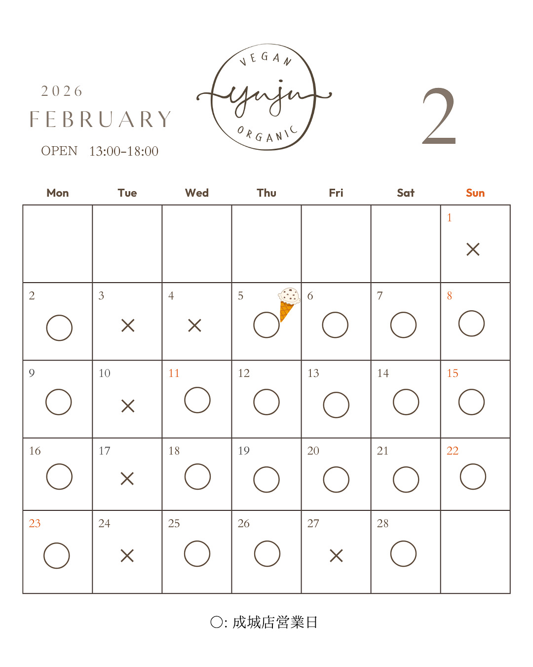 成城店の営業時間は13:00-18:00となります。