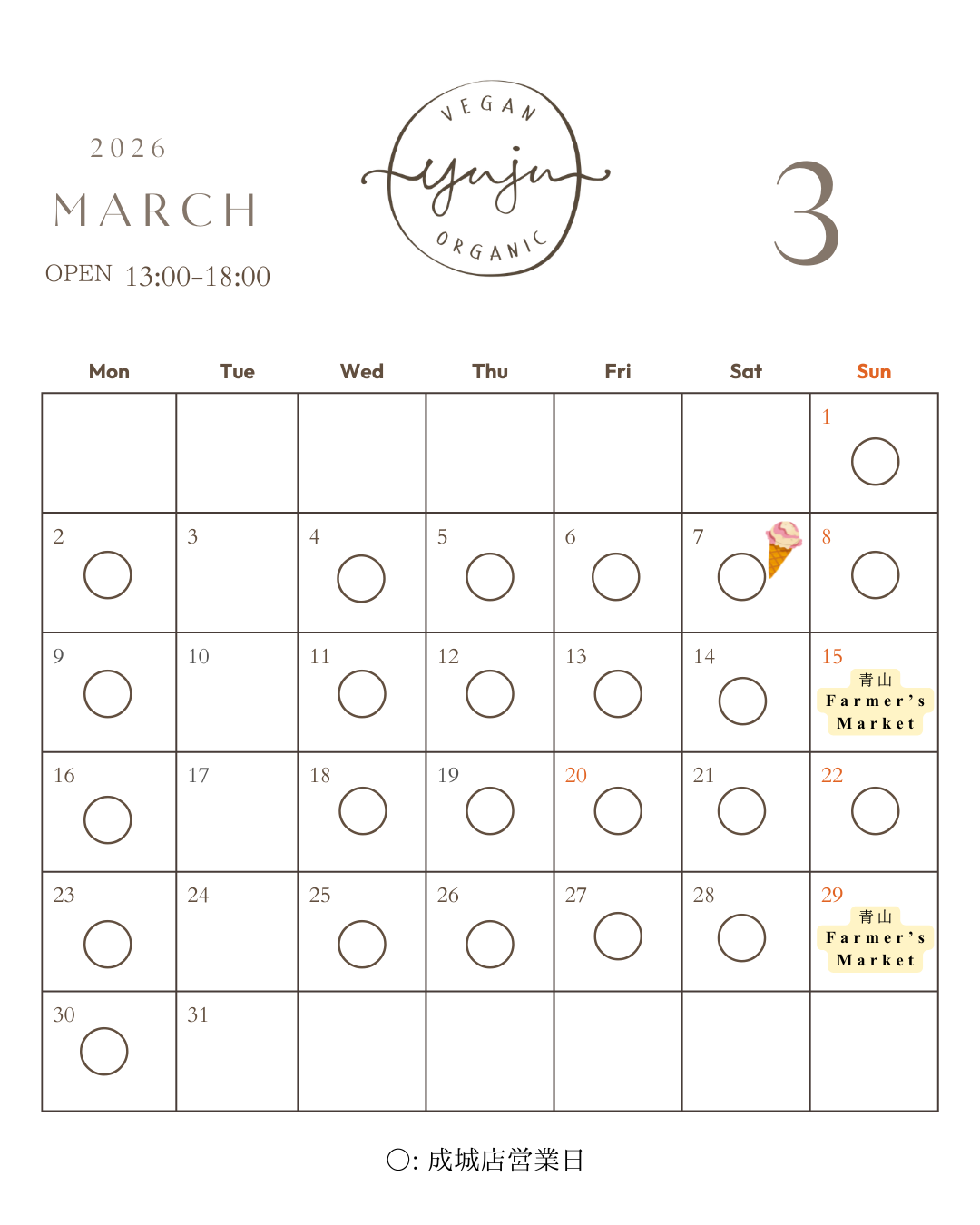 成城店:営業時間 13:00-18:00休業日: 毎週火曜日、15日(日)、29日(日)